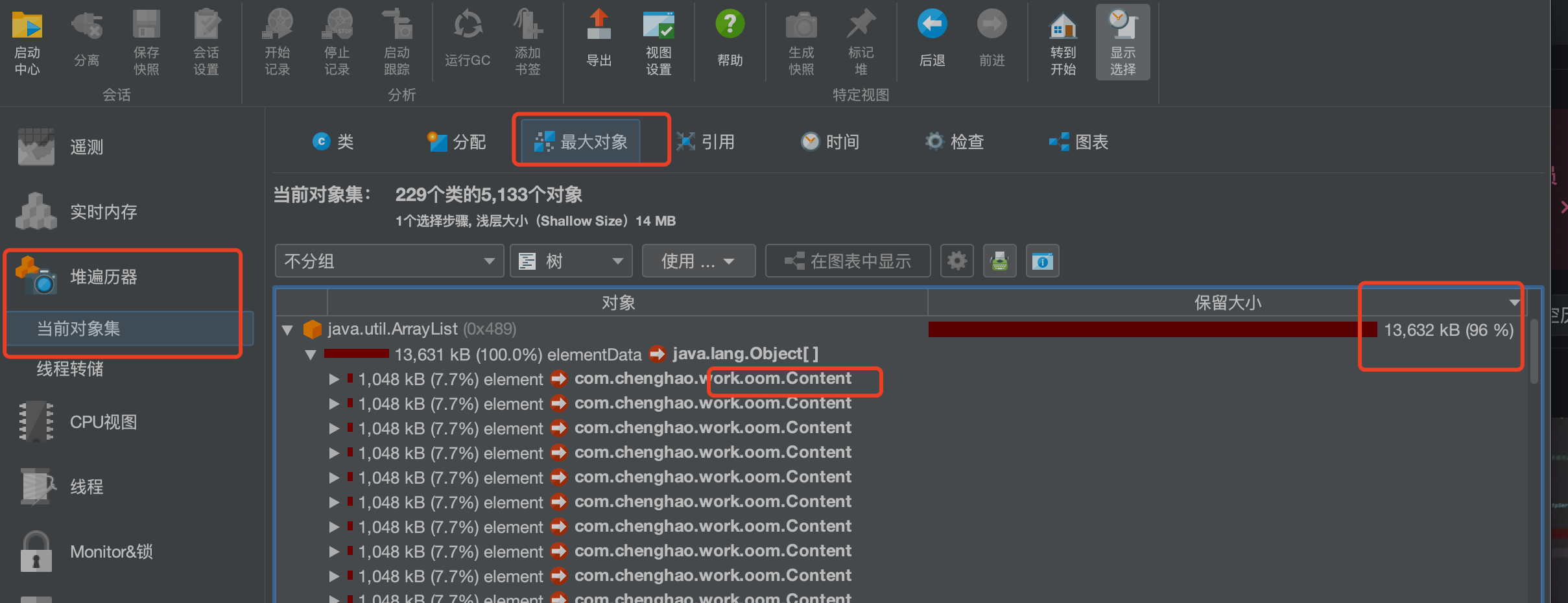 利用jprofile工具打开java_pid1221.hprof,在当前对象集的最大对象可以发现这个ArrayList对象占了百分之96