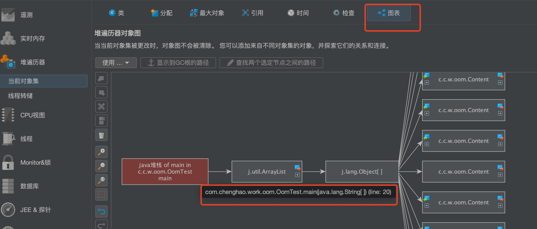 在图表中可以看到有问题的代码行数和对象调用情况。然后回到代码解决问题